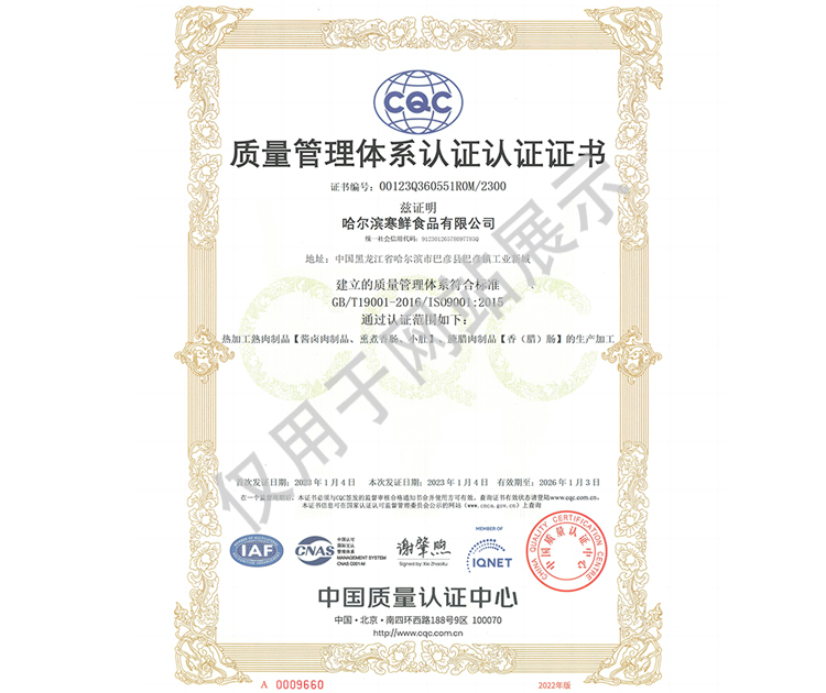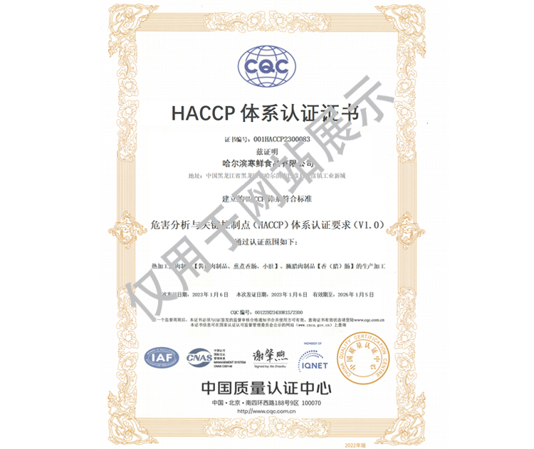 2016年公司通過了中國質量認證中心的質量管理體系(ISO9001)和食品安全管理體系(ISO22000)認證;2017年已取得國家進出口企業認證;是中國肉類協會會員單位,黑龍江省肉類協會副會長單位;2017年,公司產品經中國綠色食品發展中心審核,被認定為綠色食品A級產品;被省畜牧獸醫局確定為全國生豬屠宰標準化創建示范企業(全國僅6家)。2018年12月,被評定為市級農業產業化重點龍頭企業。2019年1月,被評定為省級農業產業化龍頭企業。