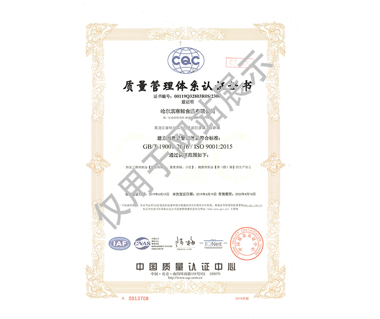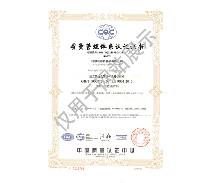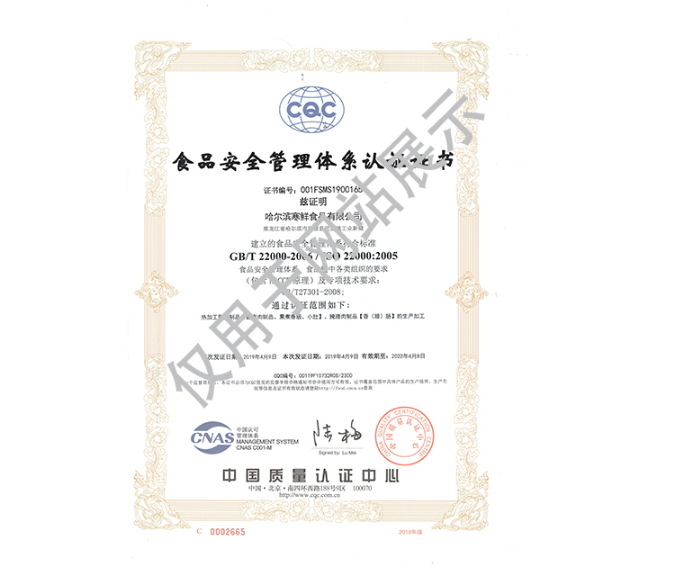 2016年公司通過(guò)了中國(guó)質(zhì)量認(rèn)證中心的質(zhì)量管理體系(ISO9001)和食品安全管理體系(ISO22000)認(rèn)證;2017年已取得國(guó)家進(jìn)出口企業(yè)認(rèn)證;是中國(guó)肉類協(xié)會(huì)會(huì)員單位,黑龍江省肉類協(xié)會(huì)副會(huì)長(zhǎng)單位;2017年,公司產(chǎn)品經(jīng)中國(guó)綠色食品發(fā)展中心審核,被認(rèn)定為綠色食品A級(jí)產(chǎn)品;被省畜牧獸醫(yī)局確定為全國(guó)生豬屠宰標(biāo)準(zhǔn)化創(chuàng)建示范企業(yè)(全國(guó)僅6家)。2018年12月,被評(píng)定為市級(jí)農(nóng)業(yè)產(chǎn)業(yè)化重點(diǎn)龍頭企業(yè)。2019年1月,被評(píng)定為省級(jí)農(nóng)業(yè)產(chǎn)業(yè)化龍頭企業(yè)。