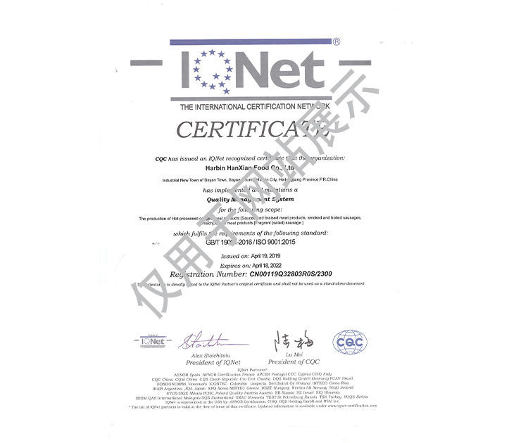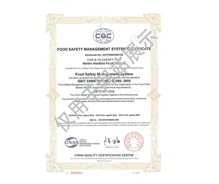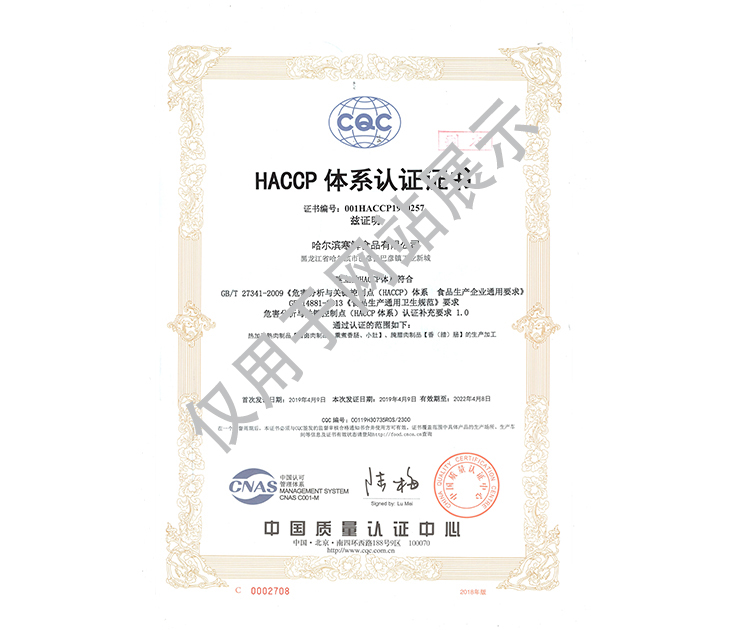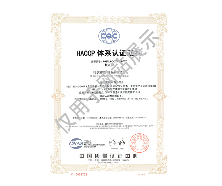 2016年公司通過了中國質量認證中心的質量管理體系(ISO9001)和食品安全管理體系(ISO22000)認證;2017年已取得國家進出口企業認證;是中國肉類協會會員單位,黑龍江省肉類協會副會長單位;2017年,公司產品經中國綠色食品發展中心審核,被認定為綠色食品A級產品;被省畜牧獸醫局確定為全國生豬屠宰標準化創建示范企業(全國僅6家)。2018年12月,被評定為市級農業產業化重點龍頭企業。2019年1月,被評定為省級農業產業化龍頭企業。